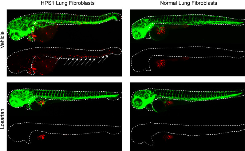 Modulation of enhanced migratory capacity of HPS lung fibroblasts (HPSLF) by losartan in vivo. HPSLF and normal lung fibroblasts (NLF) were treated with losartan or vehicle (PBS) and labeled with a CM-Dil live-cell marker (red). 75 cells were injected into the yolk sac of 48 h post-fertilization Tg(fli1:GFP, green) zebrafish embryos expressing GFP in their blood vessels. HPSLFs exhibit stronger migratory capacity than NLFs at 24 h (not shown) and 48 h after injection. Arrows indicate the migration of labeled fibroblasts from the yolk sac into outlined regions of zebrafish embryos. Treatment with losartan reduces HPSLF migratory capacity compared to baseline