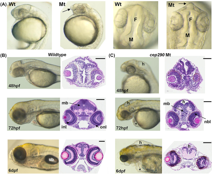 cep290 morphology (Mt) compared to wildtype (Wt) embryos. (A) Lateral and dorsal views of wholemount morphology in embryos at 24 hpf. Telencephalon (arrows) is projected forward in cep290 embryos. F, forebrain ventricle; M, midbrain ventricle. (B) Wildtype brain development at 48 hpf, 72 hpf, and 6 dpf. Left panels, wholemount morphology; right panels, transverse H and E sections through the midbrain. sb, swim bladder; mb, midbrain; onl, outer nuclear layer of the retina; inl, inner nuclear layer. Size bar = 100 μm. (C) cep290 brain development at 48 hpf, 72 hpf, and 6 dpf. Left panels, wholemount morphology; right panels, transverse H and E sections through the midbrain. h, hydrocephalus; nbl, neuroblastic layer; *periocular edema. Size bar = 100 μm.