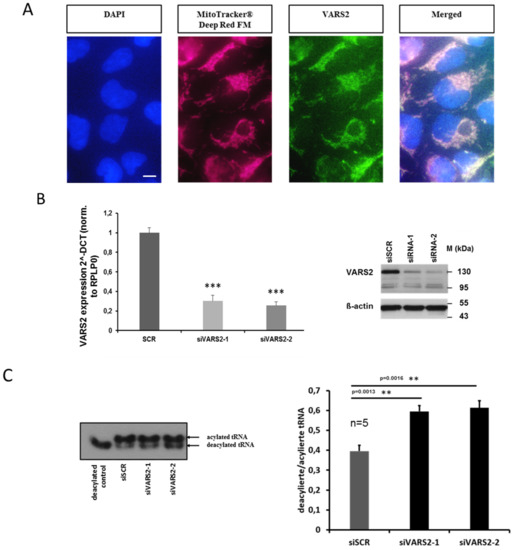 Figure 2. VARS2 is mainly localized in the mitochondria of HEK293A cells. The scale bar is 10 µm long (A). VARS2 expression is significantly reduced according to mRNA and protein levels in HEK293A cells treated with VARS2-specific siRNAs compared to control siRNA (B). HEK293A cells treated with VARS2-specific siRNAs showed significantly increased diacylation/acylation ratio in valyl-tRNA according to northern blot analysis. n = 5, siSCR mean = 0.4, SD = 0.07; siVARS2-1 mean = 0.59, SD = 0.07, p = 0.0013; siVARS2-2 mean = 0.61, SD = 0.08, p = 0.0016 (C). **≤0.01, ***≤0.001.