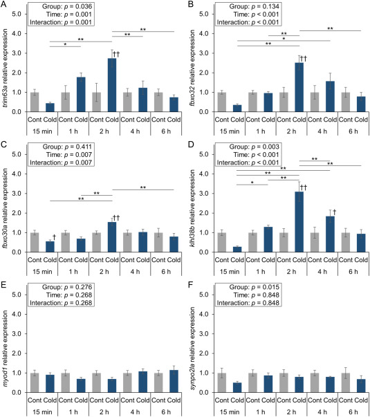 Fig. 2. The result of qPCR. A–D. Ubiquitin-related genes trim63a, klhl38b, fbxo30a, and fbxo32 (n = 10–16). E–F. Protein anabolic-related genes myod1 and synpo2la (n = 10–16). All data are presented as relative gene expression in comparison to the reference gene gapdh. In the post-hoc test, ∗p < 0.05 and ∗∗p < 0.01 indicated significance in the comparisons between different time points, and †p < 0.05 and ††p < 0.01 indicated significance in the comparison between the cold and control [cont] groups at each time point.