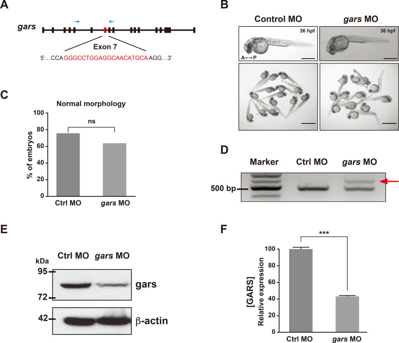 (A) Schematic of the target of the designed splicing-blocking morpholino oligos (MOs) on exon 7, targeting the zebrafish gars gene (red letters). Blue arrows indicate the targets of the primers used for RT-PCR showin in (D). (B) Images showing morphologies of control MOs- or gars MOs-injected larvae at 36 hpf. A, anterior; P, posterior. Scale bars = 500 μm (individual images); 2,000 μm (group images). (C) Quantification of zebrafish embryos showing morphological phenotypes, counted in each genotype at 5 dpf. Statistical significance was determined using unpaired Student’s t-test. ns, non-significant. (D) RT-PCR results confirming gars splicing on exon 7. A red arrow indicates an alternative splicing form induced by gars MOs. (E and F) Comparison of zebrafish gars expression between control and gars KD zebrafish. Results of immunoblot assays for gars and β-actin (E). Protein levels were normalized against β-actin in the same blots, and the quantification of gars expression is presented graphically in (F). Statistical significance was determined using unpaired Student’s t-test. ***P < 0.001.