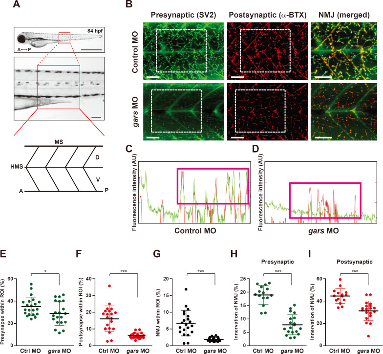 (A) Schematic showing the representative region where NMJs in the larval trunks were analyzed and observed. A, anterior; P, posterior; HMS, horizontal myoseptum; MS, myosepta; D, dorsal; V, ventral. Scale bars = 1,000 μm (top images) and 50 μm (bottom images). (B) Lateral view images after staining with anti-SV2 (presynaptic region) and α-BTX (postsynaptic region) of the whole-mounted larva injected with control or gars MOs at 84 hpf. Merged images (NMJ) are magnified from the images in the rectangular regions. Scale bars = 50 μm. (C and D) Comparison of fluorescence intensity (a.u.) (green, presynapse; red, postsynapse) between control MOs- (C) and gars MOs-injected (D) zebrafish embryos. (E-G) Comparisons of presynapse (E), postsynapse (F), and NMJ (G) signal ratios within the region of interest (ROI) between control MOs- (n = 21) and gars MOs-injected (n = 20) zebrafish embryos. Statistical significance was determined using unpaired Student’s t-test. *P < 0.05; ***P < 0.001. (H and I) Comparisons of NMJ innervation in the presynaptic area (H) and postsynaptic (I) areas between control MOs- (n = 15) and gars MOs-injected (n = 19) zebrafish embryos. Statistical significance was determined using unpaired Student’s t-test. ***P < 0.001.