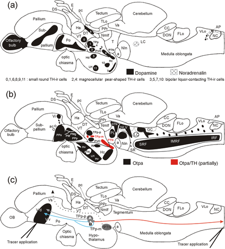 Fig. 12 Schematic lateral view of adult zebrafish brain shows summary of (a) TH-positive brain nuclei (modified from Rink & Wullimann, 2002a; Wullimann & Rink, 2002), and (b) Otpa domains. (c) Schematic lateral view of adult zebrafish brain shows telencephalic and spinal connections of posterior tubercular nuclei. In (a), Arabic numbers, which were initially introduced in our developmental studies (Rink & Wullimann, 2002a; Wullimann & Rink, 2002), are also indicated for diencephalic and hypothalamic dopaminergic cell groups. Note that descending spinal projections of dopaminergic parvocellular periventricular posterior tubercular cells (TPp-p; Becker et al., 1997), and ascending projections of dopaminergic positive TPp-p and magnocellular pear-shaped periventricular posterior tubercular cells (TPp-m; Rink and Wullimann, 2001) have been previously established in the adult zebrafish brain (in larvae: Tay et al., 2011). Furthermore, TH-negative posterior tuberal (PTN) cells project to the zebrafish pallium (Rink & Wullimann, 2001, 2004; confirmed in goldfish by Northcutt, 2006). We propose the hypothesis that there are two populations of TPp-m cells, one with exclusive ascending projections to the striatum, and one with additional spinal projections, plus additional TPp-p projections to the striatum as well as ascending projections to the pallium from the posterior tuberal nucleus. (c) is modified from Rink and Wullimann (2002b). Abbreviations: A, ansulate commissure, ac anterior commissure; AP, area postrema; ATN, anterior tuberal nucleus; CC, crista cerebellaris; DON, descending octaval nucleus; DS, saccus dorsalis; DT, dorsal thalamus; DTN, dorsal tegmental nucleus; E, epiphysis; Flo, facial (sensory) lobe, GC, central gray; Ha, habenula; Hc/Hd/Hv, caudal/dorsal/ventral zone of periventricular hypothalamus; IN, intermediate hypothalamic nucleus; LC, locus coeruleus; LH, lateral hypothalamic nucleus; LR lateral hypothalamic recess; NC, commissural nucleus of Cajal; NLV, nucleus lateralis valvulae; Nmlf, nucleus of medial longitudinal fascicle; NIn, interpeduncular nucleus; OB, olfactory bulb; oc, optic chiasma; pc, posterior commissure; PL, perilemniscal nucleus; PM, magnocellular parvocellular preoptic nucleus; PMg, gigantocellular part of PM; Po, preoptic region; PPa/PPp, anterior/posterior parvocellular preoptic nucleus; PM, magnocellular preoptic nucleus; PPr, periventricular pretectum; PTN, posterior tuberal nucleus; PVO, paraventricular organ; SR, superior raphe; SRF, superior reticular formation; T, midbrain tegmentum; TLo, torus longitudinalis; TPp-m, magnocellular cells of the periventricular posterior tubercular nucleus; TPp-p, parvocellular cells of periventricular posterior tubercular nucleus; Va, valvula cerebelli; VLo, vagal (sensory) lobe; Vd/Vi//Vs/Vv, dorsal/intermediate/supracommissural/ventral nucleus of ventral telencephalon; VT, ventral thalamus