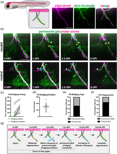 Perineurial glia form a bridge and phagocytose debris after spinal motor nerve injury. (a) (Left) Diagrammatic representation of a 6 dpf zebrafish larva with a single peripheral spinal motor nerve (inset) displayed. Motor axon (magenta), ensheathed Schwann cells (orange), perineurial glia (green). (Right) Representative images of an in vivo 6 dpf spinal motor nerve, where olig2 labels motor axons (magenta) and nkx2.2a labels perineurial glia (green). (b–f) n = 11 nerves in 5 larvae. (b) Representative stills taken from time-lapse movies of perineurial glia (green) and motor axons (magenta) in 5 or 6 dpf larvae injured on either the caudal or rostral side of the spinal motor nerve. Stills are shown in the first 6 h post injury (hpi). The dashed circle indicates the injury site. Blue arrows denote phagocytic vesicles in perineurial glia. White arrows follow the proximal end and yellow arrows follow the distal end of the perineurial glial bridge. (c) Quantification of perineurial glial (PG) bridging timing. Timing of bridging initiation (green) and completion (magenta) was recorded in minutes post injury. (d) Quantification of perineurial glial (PG) bridging duration in minutes (mean: 150.54 ± 18.25 min). (e) Quantification of the type of perineurial glial (PG) bridging observed. Proximal and distal bridging (45% of nerves, gray) or proximal only bridging (55% of nerves, black). (f) Quantification of perineurial glial (PG) phagocytosis after injury. Phagocytic vesicles on both proximal and distal perineurial glial stumps (27% of nerves, gray) or only on proximal perineurial glial stumps (73% of nerves, black). (g) Representative timeline of the first 48 h following spinal motor nerve injury in 5 to 6 dpf zebrafish. Motor axon (magenta), Schwann cells (orange), perineurial glia (green), macrophages (blue). Scale bars, 25 μm.