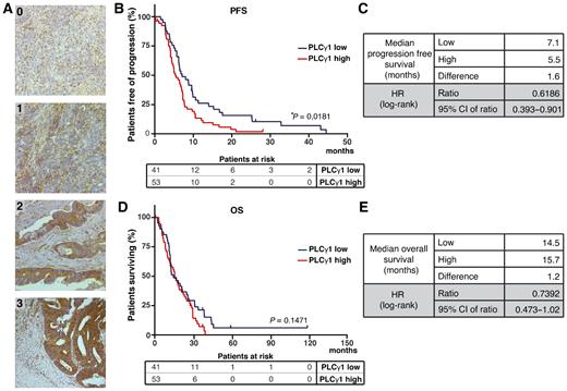 PLCγ1 expression in colorectal cancer tumors and its association with cetuximab responses. A, IHC analysis of PLCγ1 expression in human colorectal cancer specimens. Intensity of PLCγ1 cytoplasmic staining in tumor cells ranges from 0 (absence of staining) to 3 (maximal intensity; magnification, 200×). B–E, Kaplan–Meier curves of PFS and OS of patients with colorectal cancer expressing high and low levels of PLCγ1. Median time of survival for both analyses is shown in the picture. P value of the Kaplan–Meier curves was calculated using the log-rank test.