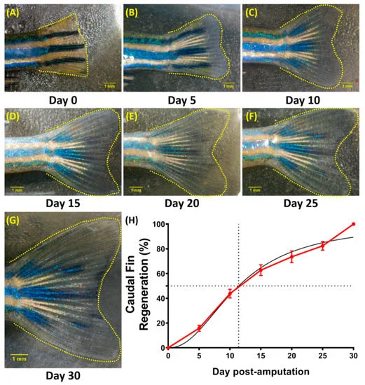 Fig. 5 Figure 5. Representative images of a caudal fin regeneration from a single fish at (A) 0, (B) 5, (C) 10, (D) 15 (E) 20 (F) 25, and (G) 30 days post-amputation. (H) Caudal fin regeneration curve during 30-day observation (red line) with the mathematical model of regeneration percentage prediction (normalized) (black line), which indicates that 50% of regeneration occurred approximately 11 days after the amputation. The data are expressed as the mean with SEM (n = 18).