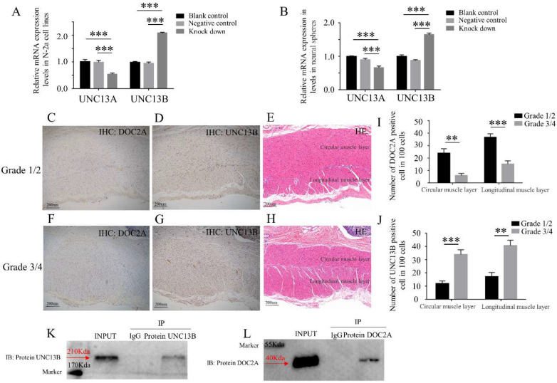 Expression relationship between DOC2A and UNC13B. (A,B) Change in UNC13B after DOC2A being knocked down in N-2a cell lines and neural spheres. (C–J) Expression levels (IHC) of DOC2A and UNC13B in different grades of HSCR patient colons. **, p < 0.01; ***, p < 0.001, one-way ANOVA with Bonferroni post hoc, n = 3. (K,L), protein interaction (CO-IP) between DOC2A and UNC13B. Abbreviations: UNC13B, unc-13 homolog B; IHC, immunohistochemistry; HE, hematoxylin-eosin staining.