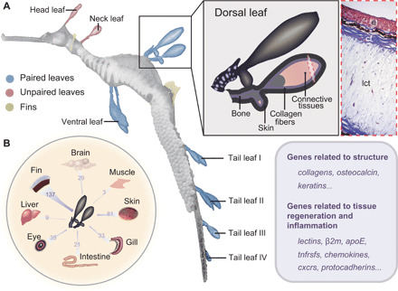 (A) Location and structure of leaf-like appendages. The inset on the right shows a zoomed in schematic of the leaf-like appendages along with its transverse section. Genes expressed in the leaf-like appendages that are related to structure, tissue regeneration, and inflammatory response have been listed in the box below. e, epidermis; cf., collagen fiber; lct, loose connective tissues. (B) The number of genes recruited from other tissues for the maintenance of leaf-like appendages.