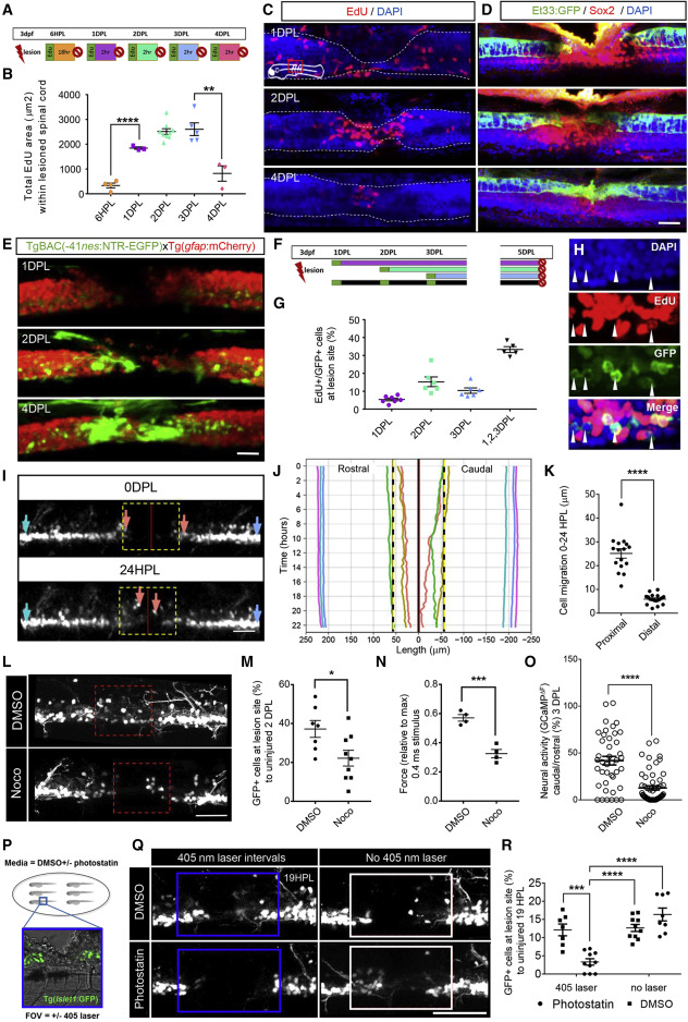 Figure 2. Tissue remodeling and regenerative neurogenesis contribute to neuronal repair after spinal cord injury in distinct temporal phases (A) Design of pulse-chase experiments; each day after injury, larvae were pulsed with EdU (1 h) and chased for the shown time. Representative images shown in (C). (B) Quantification of proliferation within the spinal cord after injury showing peak in proliferation at 2–3 DPL. (C) Representative maximum projections showing the temporal dynamics of EdU+ cells after injury. At 1DPL, EdU+ cells are located around the central canal and at 2–4 DPL, at the stumps and injury sites. The spinal cord is outlined with a white line. (D) Immunostaining showing upregulation of Sox2 along the central canal in proximal stumps at 1 DPL and injury site during 2–4 DPL (control in Figure S4). sqET33:GFP labels roof plate cells (green). Scale bar 50 μm. (E) Expression of the NSPC marker nestin after injury showing that nes:EGFP becomes detectable at the proximal stumps and at the injury site first 2–4 DPL. (F) Experimental design for the long pulse-chase neurogenesis experiment in isl1:GFP larvae. Fish were immersed in EdU for 1 h and chased until 5 DPL. (G) Quantification of EdU+/isl1:GFP+ cells (%) within the lesion site at 5 DPL. (H) Representative maximal projection of the cumulative pulse-chase. White arrow heads show isl1:GFP+/EdU− cells at the lesion site. (I) In vivo maximum projections at the lesion site in isl1:GFP at 0 and 22HPL (Video S4). Individual cells traced in (J) are shown by corresponding colored arrows. (J) Individual tracks of selected cells from time lapse in (I).The y axis represents time (H) and the x axis represents the distance along the length axis of the spinal cord relative to the lesion center. (K) Quantification of cell movement 0–22HPL showing increased recruitment of proximal cells compared with distal. n = 3–4 cells/segment/fish, n = 4 fish. Scale bar 50 μm. (L) Maximum projection images of control and nocodazole (Noco)-treated isl1:GFP fish at 2 DPL showing few cells or processes at the lesion site (red box). (M) Quantification of cells isl1:GFP+ cells at the lesion site showed a decreased number of cells after Noco treatment at 2 DPL, but Noco treatment did not alter cell proliferation (Figure S2N). (N) Quantifying force generation in SCL larvae treated with Noco compared with control 2. A 43% reduction in force production was detected in Noco-treated fish, n = 4. (O) Quantification of GCaMP6s ΔF caudal to injury at 3 DPL showed significantly reduced neural activity in fish treated with Noco. (P) Overview of the photostatin experiment. Injured larvae were immersed with 10 μM or vehicle control and exposed to 405-nm light (blue box) to activate the compound at the lesion site. (Q) Representative maximum projection images of isl1:GFP fish treated with vehicle or photostatin. (R) Quantification of isl1:GFP cells at the lesion site showing significantly reduced number of cells in the photoactivated photostatin cohort compared with controls (n = 3–9 larvae, error = SEM (standard error of the mean), ∗∗p < 0.01, ∗∗∗p < 0.001, ∗∗∗∗p < 0.0001).