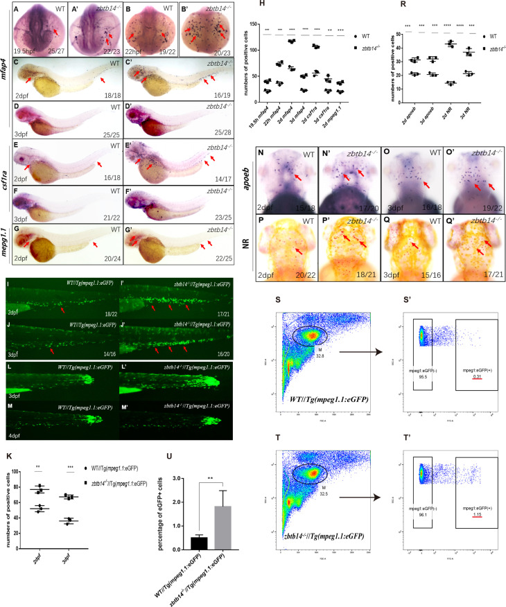 (A–G’) Whole-mount in situ hybridization (WISH) analyses of macrophage markers mfap4 (A–D’), csf1ra (E–F’), mpeg1.1 (G, G’) from 19.5 hr post-fertilization (hpf) to 3 days post-fertilization (dpf) in wild type (WT) and zbtb14-deficient embryos and larvae. Red arrows indicate the main positions of positive cells for each marker. n/n, number of embryos/larvae showing representative phenotype/total number of embryos/larvae examined. (H) Statistical results for A–G’ (Student’s t test, N=3, 14–28 embryos were used for each probe. Each dot represents the mean value of one experiment, which was obtained from the counts of all of the embryos/larvae in the same group. Error bars represent mean ± standard error of the mean (SEM). **p<0.01, ***p<0.001, ****p<0.0001). (I–J’) GFP positive cells were increased in zbtb14-/-//Tg(mpeg1.1:eGFP) embryos at 2 and 3 dpf. (K) Statistical results for I–J’ (Student’s t test, N=3, 14–22 larvae were used for each experiment. Each dot represents the mean value of one experiment. Error bars represent mean ± SEM. **p<0.01, ***p<0.001). (L–M’) GFP positive cells in both Tg(mpeg1.1:eGFP) and zbtb14-/-//Tg(mpeg1.1:eGFP) larvae can migrate to the wound. (N–Q’) apoeb and neutral red positive cells were both increased in zbtb14-deficient larvae at 2 and 3 dpf. (R) Statistical results for N–Q’ (Student’s t test, N=3, 15–22 larvae were used for each experiment. Each dot represents the mean value of one experiment. Error bars represent mean ± SEM. ***p<0.001, ****p<0.0001). (S–T’) Representative scatterplot generated by FACS analysis of WKM samples collected from WT Tg(mpeg1.1:eGFP) (up panel) and zbtb14-/-//Tg(mpeg1.1:eGFP) (bottom panel) zebrafish lines in 4-month-old adults. M: myeloid gate. (U) Statistical results for S–T’ in WT Tg(mpeg1.1:eGFP) and zbtb14-/-//Tg(mpeg1.1:eGFP) zebrafish. (Student’s t test, N=4, each time one male and one female were used in the WT and mutant groups. Error bars represent mean ± SEM. **p<0.01).