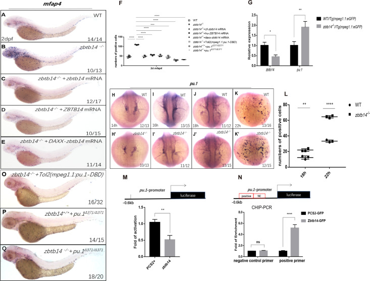 (A–E) mRNA rescue assays in zbtb14-/- larvae. mfap4 probe was used in whole-mount in situ hybridization (WISH) to examine rescue effect with wild zbtb14 (C), ZBTB14 (D), DAXX-ZBTB14 (E) mRNA injections. (F) Statistical result for A–E and O–Q. The statistical significance was calculated by using one-way analysis of variance (ANOVA). The statistical significance was calculated using one-way ANOVA followed by Dunnett T3 correction. The asterisk indicates a statistical difference. (N=3, 10–32 larvae were used for each experiment. Each dot represents the mean value of one experiment. Error bars represent mean ± standard error of the mean (SEM). ****p<0.0001.) (G) Quantitative reverse transcriptase polymerase chain reaction analysis of zbtb14 and pu.1 in GFP positive cells enriched from Tg(mpeg1.1:eGFP) and zbtb14-/-//Tg(mpx:eGFP) larvae at 2 days post-fertilization (dpf). To determine the relative expression rate, data were normalized to the expression level of wild type (WT) groups (which were set to 1.0) after normalized to the internal control of β-actin (Student’s t test, N=3. Error bars represent mean ± SEM. *p<0.05, **p<0.01). (H–K’) Serial WISH analyses of pu.1 in WT and zbtb14-/- embryos. (L) Statistical results for H–K’ (Student’s t test, N=3, 10–16 embryos were used. Each dot represents the mean value of one experiment, which was obtained from the counts of all of the embryos in the same group. Error bars represent mean ± SEM. **p<0.01, ****p<0.0001). (M) Luciferase reporter assay of Zbtb14 on the pu.1 promoter. Bars showed the relative luciferase activity on the zebrafish pu.1 promoter (–0.6 kb). (Student’s t test, N=3. Error bars represent mean ± SEM. **p<0.01.) (N) Chromatin immunoprecipitation polymerase chain reaction (ChIP-PCR) analysis of pu.1 promoter in zebrafish larvae expressing GFP or Zbtb14-GFP using an anti-GFP antibody. Positive: the location of the positive primers. NC: the location of the negative control primers. The statistical significance was calculated by using one-way ANOVA. The asterisk indicates a statistical difference. (N=3. Error bars represent mean ± SEM. ns: not statistically significant, ****p<0.0001.) (O–Q) WISH assay of mfap4 in zbtb14-/- mutants injected with TOL2 mpeg1.1:Pu.1 DBD, pu.1Δ371/Δ371 mutants, and zbtb14-/-//pu.1Δ371/Δ371 double mutants.