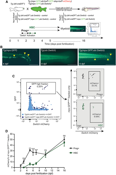(A) Experimental schema of 4-OHT-inducible lineage tracing to examine larval granulocyte production from Prog+− and HSC-labeled cohorts. Granulocytes are distinguished by high GFP expression from the mpx:GFP transgene compared to the low GFP intensity of ubi:Switch.