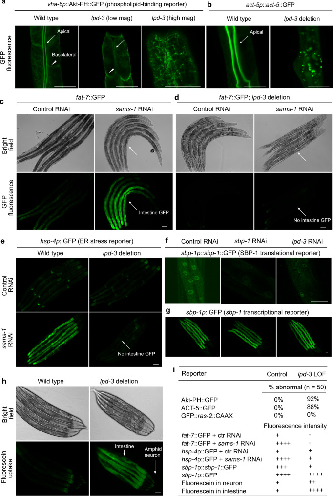 Fig. 3 a Representative confocal fluorescence images showing PIP3-binding Akt-PH::GFP reporters in wild type (apical intestinal membrane, arrow; basolateral membrane, arrow head) and lpd-3(ok2138) mutants at both low and high magnifications. b Representative confocal fluorescence images showing the actin reporter act-5p::act-5::GFP in wild type (apical intestinal membrane, arrow) and lpd-3(ok2138) mutants. c Representative bright-field and epifluorescence images showing activation of fat-7::GFP by RNAi against sams-1. d Representative bright-field and epifluorescence images showing activation of fat-7::GFP by RNAi against sams-1 in wild type but not lpd-3(ok2138) mutants (arrow). e Representative epifluorescence images showing activation of the hsp-4p::GFP ER stress reporter by RNAi against sams-1 in wild type but not lpd-3(ok2138) mutants (arrow). f Representative confocal fluorescence images showing reduced abundance of nuclear sbp-1p::sbp-1::GFP by RNAi against sbp-1 or lpd-3. g Representative epifluorescence images showing no apparent changes of sbp-1p::GFP by RNAi against sbp-1 or lpd-3. h Representative epifluorescence images showing markedly increased membrane permeability for fluorescein in lpd-3(ok2138) mutants. i Table summary of reporter phenotypes of indicated genotypes or conditions. Scale bars, 50 µm.