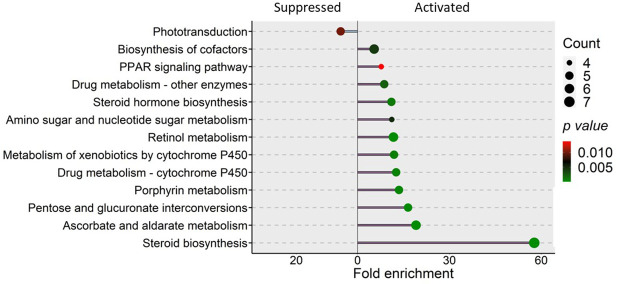 KEGG pathways that were enriched in the zebrafish larvae from the soybean group. Differentially expressed genes in the soybean (SBM) group compared to the control (CT) group were employed for the pathway enrichment analysis. The size of the circles is proportional to the gene count and gradient color bar intensity of circle correlates with the