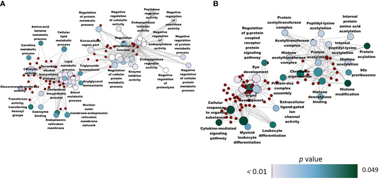 Network plot showing the link between the enriched GO terms. The enriched GO terms that were unique (from the BG and SBM vs CT comparisons) to the zebrafish larvae fed with the BG diet are shown in the figure, and 298 and 95 genes were significantly