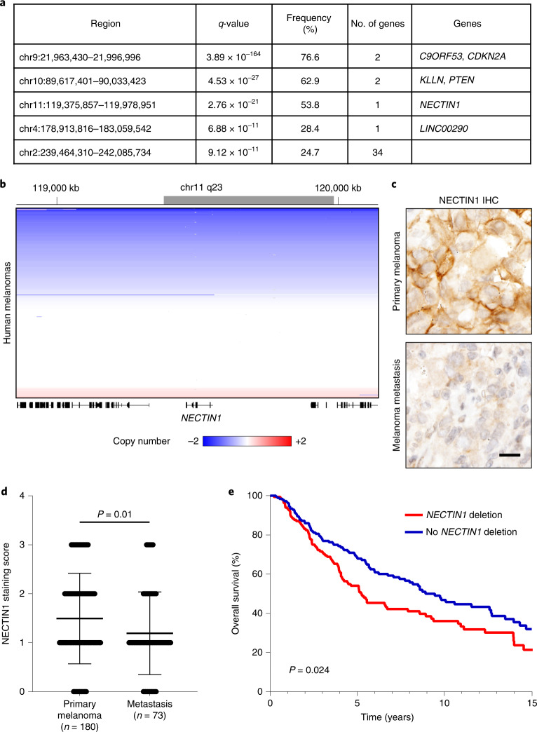 Fig. 1 a, List of the five most significant chromosomal deletions found in TCGA dataset of 363 human cutaneous melanomas. False discovery rate q-values were calculated by GISTIC. b, Linear copy number of the NECTIN1 locus in human melanoma (363 samples represented on the y axis). Blue denotes deletions, red, amplifications. The gray bar on the scale represents the focal deletion found by GISTIC analysis. c, Images of human melanoma sections stained for NECTIN1 by immunohistochemistry. Scale bar, 20 μm. d, Quantification of overall NECTIN1 staining intensity in 180 primary melanomas and 73 melanoma metastases (mean ± standard deviation (s.d.). Two-tailed t-test. e, Overall survival curves of patients with melanoma stratified according to NECTIN1 copy number status (> −0.25: no deletion, n = 190; < −0.25: deletion, n = 168 (log-rank test).