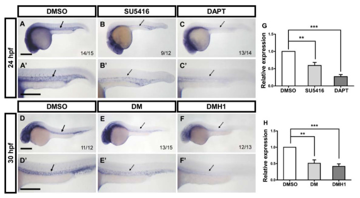 Interactions among gtpbp1l, VEGF/Notch, and BMP signals. (A–C) At 24 hpf, the expression level of gtpbp1l was decreased in SU5416-treated (B) and DAPT-treated embryos (C) compared to DMSO-treated control embryos. (D–F) At 30 hpf, inhibition of BMP signals by DM or DMH1 treatment reduced the expression of gtpbp1l in embryos compared with that in DMSO-treated control embryos. (A’–F’) Enlargements of (A–F). (G) The relative expression level was quantified by the qPCR assay and showed a significantly decreased expression of gtpbp1l in SU5416-treated (0.59 ± 0.23) and DAPT-treated (0.27 ± 0.12) embryos compared to controls. (H) Quantification of the relative expression level by qPCR analysis in DM-treated (0.51 ± 0.23) and DMH1-treated (0.42 ± 0.19) embryos had the reduced expression of gtpbp1l, which is normalized to DMSO-treated controls. Values on the bottom right indicate the number of embryos exhibiting the phenotype per total number of embryos analyzed. Data are represented as means ± S.D. *** refers to p < 0.0001 and ** p < 0.001 by unpaired Student’s t-test. Scale bars are 200 µm.