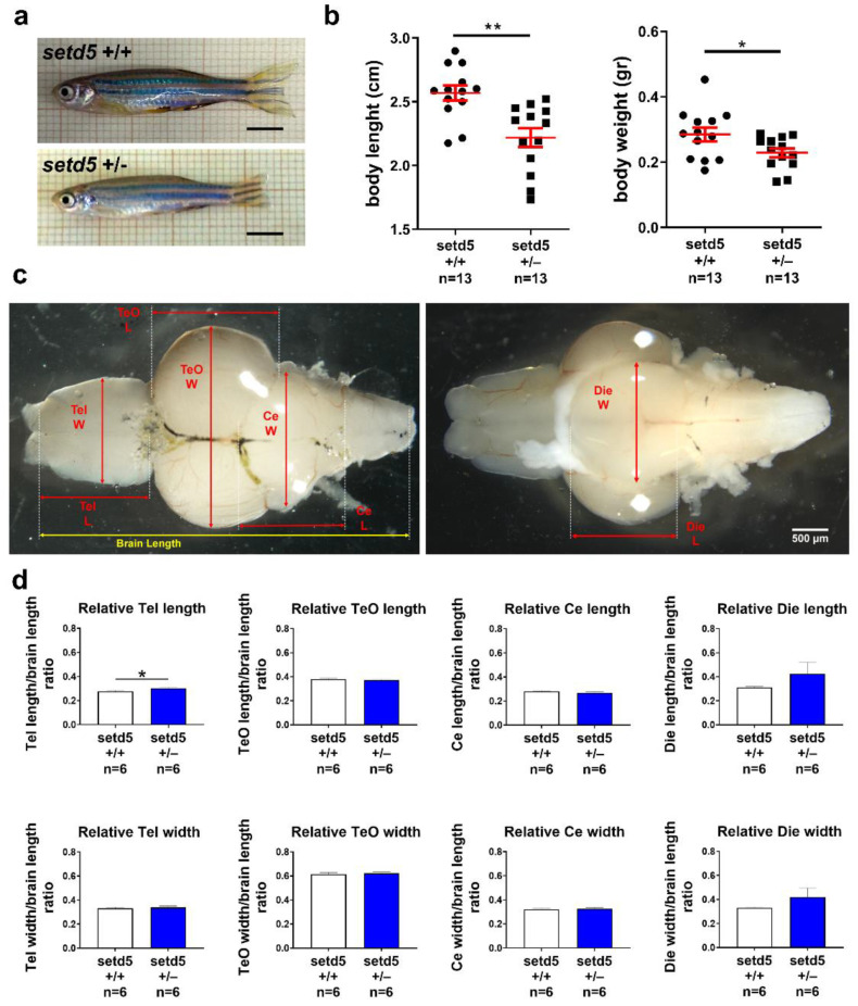 Figure 3 setd5 haploinsufficiency causes a growth delay in adult mutant zebrafish. (a) Representative images of 10-month-old setd5+/+ and setd5+/− zebrafish adults. Scale bar 500 μm. (b) Body length and body weight analysis in setd5+/+ and setd5+/− 10 months-old zebrafish adults. n = number of adults analyzed. (c) Representative images of adult brains from 10-month-old setd5+/+ zebrafish adults, evidencing the different measurements conduced for the morphometrical analysis included in (d). W, width; L, length. (d) Relative Telencephalon (Tel) length and width, Optic tectum (TeO) length and width, Cerebellum (Ce) length and width, Diencephalon (Die) length and width in adult brain, normalized to the entire brain length, from 10-month-old setd5+/+ zebrafish adults. Absolute values are included in Figure S5. (d) n = number of adult brains analyzed. Data are expressed as mean ± SEM. Statistical analysis was performed by Student’s t-test. * p < 0.05; ** p < 0.01.