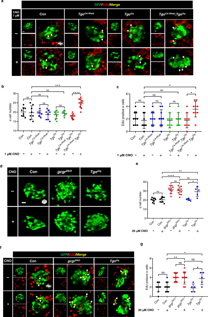 a Representative images of EdU staining in control, TgαCA-Rheb, TgαGq, and TgαCA-Rheb;TgαGq larvae treated with 1 μM CNO or vehicle for 48 h at 5 dpf. EdU (red)-positive α cells are indicated by arrows (scale bar, 10 μm). b Quantification of α cell numbers in control, TgαCA-Rheb, TgαGq, and TgαCA-Rheb;TgαGq larvae treated with 1 μM CNO or vehicle for 48 h at 5 dpf. (data represent the means ± SD, n = 8, 8, 6, 8, 8, 6, 9, and 11 for each group, respectively). c Quantification of EdU-positive α cell numbers in control, TgαCA-Rheb, TgαGq, and TgαCA-Rheb;TgαGq larvae treated with 1 μM CNO or vehicle for 48 h at 5 dpf (data represent the means ± SD, n = 9 for each group). d Representative images of α cells in control, gcgrDKO, and TgαGq larvae treated with 20 μM CNO or vehicle for 48 h at 5 dpf (scale bar, 10 μm). e Quantification of α cell numbers in control, gcgrDKO and TgαGq larvae treated with 20 μM CNO or vehicle for 48 h at 5 dpf (data represent the means ± SD, n = 9, 9, 9, 9, 5, and 5 for each group, respectively). f Representative images of EdU staining in control, gcgrDKO and TgαGq larvae treated with 20 μM CNO or vehicle for 48 h at 5 dpf. EdU (red)-positive α cells are indicated by arrows (scale bar, 10 μm). g Quantification of EdU-positive α cell numbers in control, gcgrDKO and TgαGq larvae treated with 20 μM CNO or vehicle for 48 h at 5 dpf (data represent the means ± SD, n = 10, 10, 10, 10, 5, and 5 for each group, respectively). *P < 0.05, **P < 0.01, ***P < 0.001, ****P < 0.0001, NS indicates no significant difference (one-way ANOVA, Tukey’s multiple comparisons test, the quantifications represent individual islet sections). Source data are provided as a Source Data file.