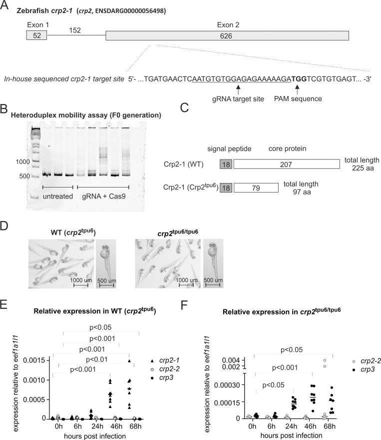 A) A schematic presentation of the zebrafish crp2-1 (crp2, ENSDARG00000056498) gene structure and the gRNA target site for CRISPR-Cas9 mutagenesis. The target site sequence with depicted gRNA target sequence and protospacer adjacent motif (PAM) site were verified with Sanger sequencing. B) Successful mutagenesis in the embryos injected with target specific gRNA and Cas9 protein was verified with heteroduplex mobility assay. In the heteroduplex mobility assay, multiple bands on polyacrylamide gel after heteroduplex formation indicate the presence of insertion/deletion mutations at the target site. C) Schematic representation of the structure of wild type (WT) Crp2-1 protein and the structure of Crp2tpu6 mutant protein after introduction of +23 nucleotide insertion and premature stop codon by CRIPSR-Cas9 mutagenesis. D) Homozygous crp2tpu6/tpu6 larvae have normal morphology under standard laboratory conditions. The panel shows an overview and a representative image of a single larvae of 2 dpf wild type (WT (crp2tpu6)) and homozygous (crp2tpu6/tpu6) larvae of F3 generation. Images were taken with Lumar V.12 fluorescence stereomicroscope with an exposure time of 100 ms. E) crp2-1 expression is induced in WT (crp2tpu6) larvae at 24 hpi. F) crp3 expression is induced in homozygous crp2tpu6/tpu6 larvae at 24 hpi. In E and F, the expression relative to eef1a1l1 expression was measured with the 2-ΔCt method from the pools of five WT or mutant larvae infected with 241 cfu of S. pneumoniae. The line depicts the median expression level, and the statistical analyses were conducted with Kruskal-Wallis test with Dunn’s multiple comparisons test. Comparisons were only done to 0 h time point of the same gene.