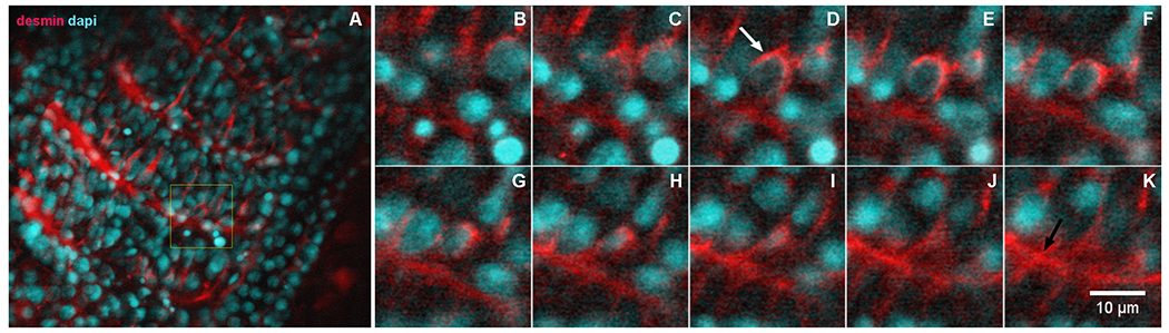 Desmin accumulates at the perinuclear region of early somites in zebrafish embryos. 24-h zebrafish embryos were labeled with an antibody against the muscle-specific intermediate filament protein desmin (red, in A–K) and with the nuclear dye DAPI (cyan, in A–K). Higher magnifications of the area marked in the inset in (A) are shown in images (B–K). Immunofluorescence confocal images of different focal planes (1 μm apart, in B–K) show the perinuclear localization of desmin (white arrow in D) in somite 28 at the most caudal region of a 24-h zebrafish embryo. Desmin is also found at the septa between adjacent muscle somites 28 and 29 in zebrafish embryos (black arrow in K). Scale bar in K = 10 μm. N = 4 independent experiments.