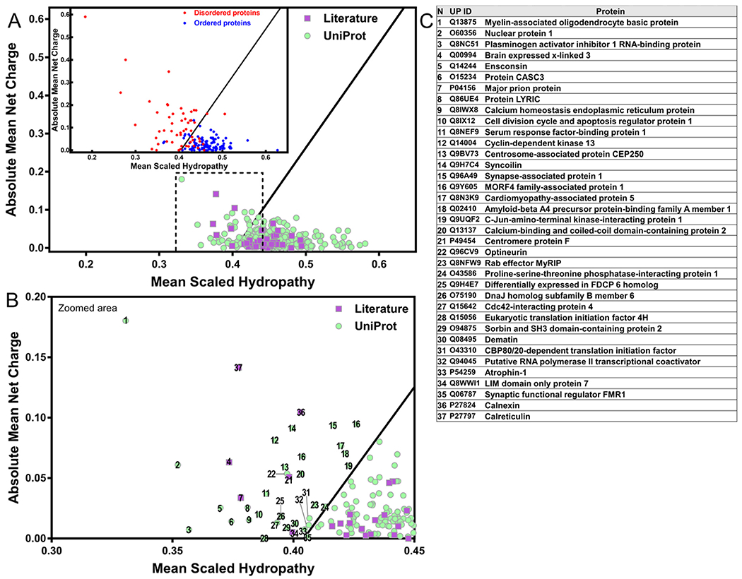 Fig. 5 Some proteins of the perinuclear region show the unusual chemical characteristics of IDPs. (A) The charge-hydropathy analysis of the human perinuclear proteins retrieved from the UniProt database (purple squares) and literature (green circles). Inset: globular folded proteins represented as blue circles and natively unfolded proteins as red dots. (B) Zoomed area marked by dashed line from “A”. (C) List of perinuclear proteins with the exquisite charge-hydropathy of IDPs, numbers refer to “B”. Plot described by [29] using 275 globular proteins (blue circles) and 91 IDPs (red circles) that enable differentiation (black line) by their charged and hydrophobic nature at pH 7.0 and obtained by PONDR (available at http://www.pondr.com/).