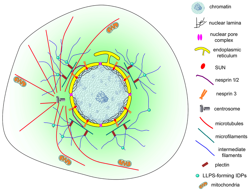 Schematic representation of the nuclear cloud of eukaryotic cells. This model illustrates the complex organization of the perinuclear space (shown in light green) of eukaryotic cells. An intricate 3D network of cytoskeletal filaments is found attached to the nuclear membrane (yellow). Several proteins participate in this organization: cytoskeletal (microfilaments in green, microtubules in red and intermediate filaments in blue) and cytoskeletal associated proteins (plectin, alpha-actinin, and others), nesprins, SUNs, among many others. Dynamic biomolecular condensates drove by intrinsically disordered proteins (IDPs), have a higher propensity to be assembled (small green spheres). Different organelles and cellular structures are also present in the nuclear could: mitochondria (orange), lysosomes, endoplasmic reticulum, Golgi, vesicles, centrosome (grey), and myofibers (in muscle cells).