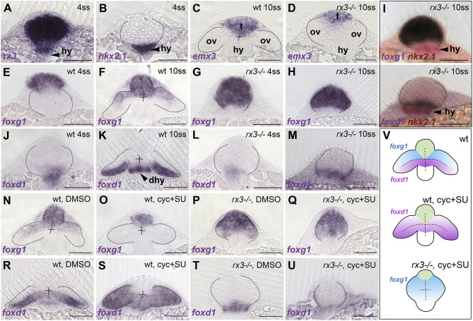 Fig. 1. foxd1 expression is reduced in rx3−/− mutant optic vesicles and lost in rx3−/− upon combined abrogation of Shh and Fgf. (A-U) Frontal sections at the level of the forming telencephalon, optic vesicles and hypothalamus, with dorsal upwards; genotype, stage and/or treatment are indicated in the top right corner and the genes analysed are indicated in the bottom left corner. (A-D) Expression of rx3 (A) and nkx2.1 (B) in 4 ss wild-type/rx3−/− embryos (indistinguishable at this stage with a representative embryo shown) and emx3 in 10 ss wild-type (C) and rx3−/− (D) embryos, highlighting the prospective telencephalic (t), hypothalamic (hy) and eye-forming (ov) domains. (E-H,J-M) Expression of foxg1 (E-H) and foxd1 (J-M) in 4 ss (E,G,J,L) and 10 ss (F,H,K,M) embryos. (I) Double in situ hybridisation of foxd1 or foxg1 and nkx2.1 (red) to show the relationship between optic vesicles and the hypothalamus. (N-U) 10 ss stage embryos showing expression of foxg1 (N-Q) or foxd1 (R-U) in embryos treated with DMSO (N,P,R,T) or cyclopamine+SU5402 (O,Q,S,U). (V) Schematic representation of the conditions in R-U. Thirty to 50 embryos were treated and processed together per experiment and marker. rx3−/− embryos were recovered at the expected mendelian proportions and the phenotypes observed were fully penetrant. Scale bars: 100 µm. Dashed lines indicate the contour of the optic vesicles. dhy, dorsal hypothalamus; hy, hypothalamus; ov, optic vesicles; t, telencephalon.