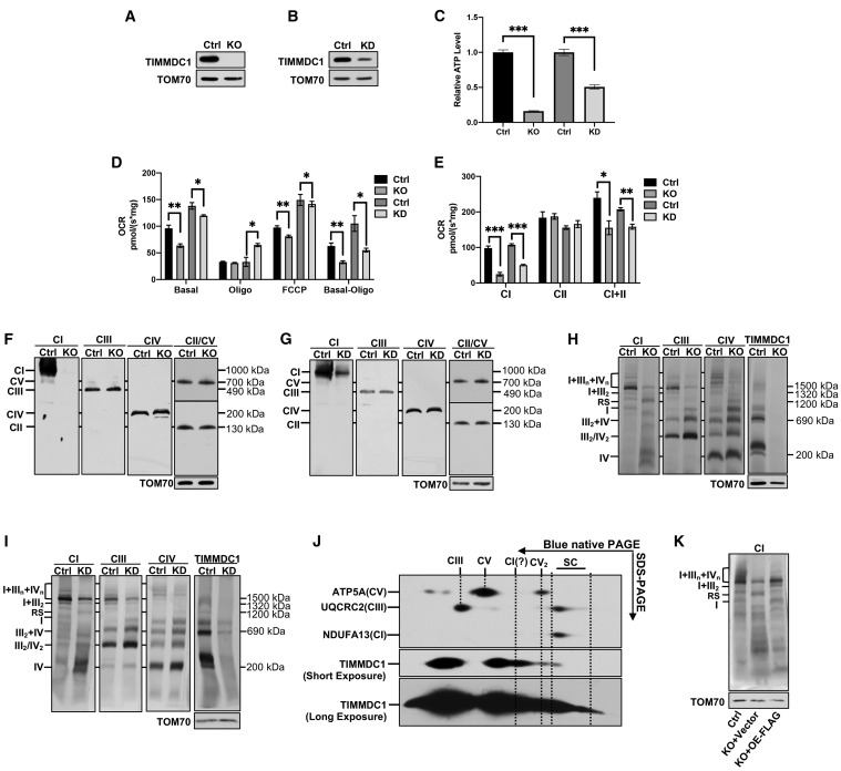 Figure 1. Loss of TIMMDC1 leads to the accumulation of respirasome subcomplex (A and B) Western blot (WB) analysis of the steady-state levels of TIMMDC1 in HEK293T cells with KO of TIMMDC1 (A), KD of TIMMDC1 (B), and paired control cells (Ctrl). TOM70 was used as an internal control. (C) Cellular ATP content in HEK293T cells with KO and KD of TIMMDC1 and paired control cells (Ctrl). (n = 3) (D) Cell respiration was determined by measuring the oxygen consumption rate (OCR) in HEK293T cells with KO and KD of TIMMDC1 and in paired control cells (Ctrl). Endogenous respiration is presented as follows: basal, basal-cell respiration; oligo, the non-phosphorylating proton leaked respiration measured in the presence of oligomycin (2 μg/mL); FCCP, un-coupling respiration measured in the presence of carbonyl cyanide 4-(trifluoromethoxy)phenylhydrazone (2.5 μM); basal-oligo, absolute respiration of ADP to ATP phosphorylation. (n = 3) (E) Respiratory complex-dependent OCR in HEK293T cells with KO and KD of TIMMDC1 and in paired control cells (Ctrl). CI, respiration in the presence of malate and glutamate. CII, respiration in the presence of succinate. CI+CII, respiration in the presence of malate, glutamate, and succinate. (n = 3) (F and G) Steady-state levels of OXPHOS complexes were analyzed in HEK293T cells with KO (F) and KD (G) of TIMMDC1 and in paired control cells (Ctrl). N-dodecyl β-d-maltoside (DDM) solubilized protein was separated by 3.5%–16% blue-native PAGE. OXPHOS complexes were detected by immunoblotting with antibodies against proteins as indicated (CI, NDUFA13; CII, SDHA; CIII, UQCRC2; CIV, MT-CO1; CV, ATP5A). Complexes I–V are abbreviated as CI–V. TOM70 was used as an internal control. (H and I) Respiratory supercomplexes were analyzed in HEK293T cells with KO (H) and KD (I) of TIMMDC1 and in paired control cells (Ctrl). Digitonin-solubilized protein was separated by 3%–11% blue-native PAGE. Respiratory supercomplexes were immunoblotted with antibodies as indicated (CI, NDUFB6; CIII, UQCRC2; CIV, MT-CO1). TOM70 was used as an internal control. (J) 2D blue-native PAGE/tricine SDS-PAGE and immunoblotting analysis of HEK293T cells. Digitonin-solubilized protein was separated by 1D 3%–11% blue-native PAGE, followed by 2D tricine SDS-PAGE. OXPHOS complexes were immunoblotted with anti-CI (NDUFB6), -CIII (UQCRC2), -CV (ATP5A), and -TIMMDC1 antibodies. (K) Blue-native PAGE and immunoblotting analysis of HEK293T cells (Ctrl), TIMMDC1−/− cells with empty vector (KO+vector), and TIMMDC1−/− cells with re-expression of FLAG-tagged TIMMDC1 (KO+OE-FLAG; OE [overexpression]). Digitonin-solubilized protein was separated by 3%–11% blue-native PAGE and then immunoblotted with the anti-NDUFB6 (CI) antibody. TOM70 was used as an internal control. Quantitative data were generated from three independent experiments. Data are presented as the means ± SEM. ∗p < 0.05, ∗∗p < 0.01, ∗∗∗p < 0.001.