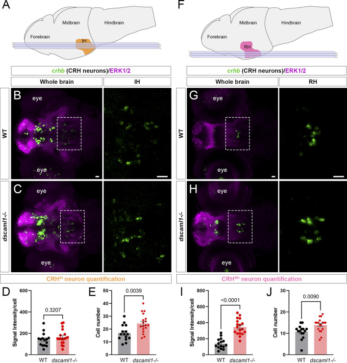 dscaml1 deficiency alters the development of CRH neurons in the intermediate and rostral hypothalamus. (A) Illustration of the larval brain, with the IH highlighted in orange. Imaging planes used for CRHIH neuron analysis are shown (light blue planes). (B, C) Labeling of CRHIH neurons by crhb FISH (green) and co-stained with anti-ERK1/2 (magenta). Representative confocal sub-stacks containing the IH are shown, with the IH (boxed region) enlarged and shown in the right panel without the ERK1/2 co-stain. WT brain is shown in panel B and dscaml1−/− brain is shown in panel C. (D–E) Quantification of the signal intensity per cell (D) and cell number (E). (F) Illustration of the larval brain, with the RH highlighted in pink. Imaging planes used for CRHRH neuron analysis are shown (light blue planes). (G–H) Labeling of CRHRH neurons by crhb FISH (green) and co-stained with anti-ERK1/2 (magenta). Representative confocal sub-stacks containing the RH are shown, with the RH (boxed region) enlarged and shown in the right panel without the ERK1/2 co-stain. WT brain is shown in panel G and dscaml1−/− brain is shown in panel H. (I–J) Quantification of the signal intensity per cell (I) and cell number (J). WT: n = 15. dscaml1−/−: n = 18. Scale bars are 20 μm. Mean, standard error, and p values are shown.