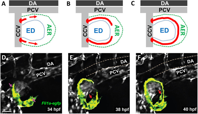 Formation of the primitive pectoral artery. (A-C) Schematics illustrating the stages of primitive pectoral artery formation, including initial dorsal and ventral sprouts from the CCV (A), elongation of these sprouts along the rim of the growing fin (B), and linkage of the two segments to form a complete primitive pectoral artery vascular arc (C). DA, dorsal aorta; ED, endoskeletal disk; PCV, posterior cardinal vein. (D-F) Still images taken from a time-lapse confocal time series of primitive pectoral artery formation in a Tg(fli1a:egfp)y1 transgenic zebrafish at 34 hpf (D), 38 hpf (E) and 40 hpf (F). Pink arrows indicate the emerging sprouts migrating into the pectoral fin, and red arrows indicate the emerging ventral arterial sprout. See Movie 2 for the complete time-lapse series. Images shown are representative of data collected from 12 separate embryos. Scale bar: 40 μm (D-F).