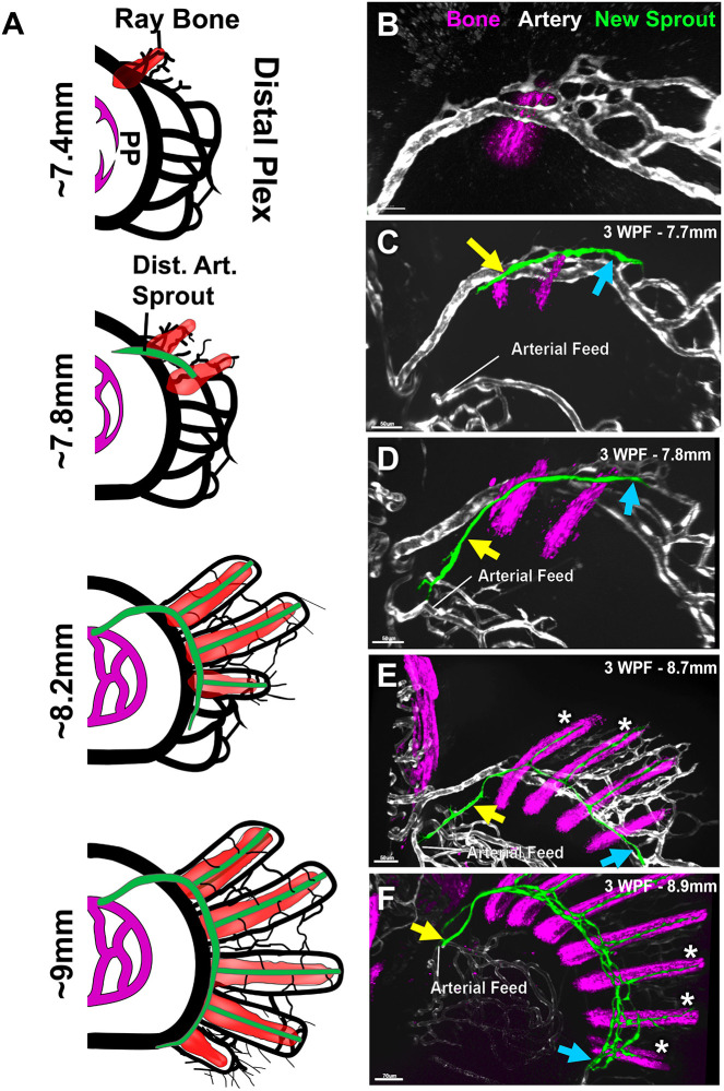 The formation of the distal fin-ray arterial network begins as a sprout from the distal venous plexus. (A) Schematic of the relationship between the developing fin-ray bones (red) and developing fin-ray arterial network (green) that emerges from the pectoral fin distal vascular plexus (black) in ∼7.4-9.0 mm fish. (B-F) Confocal images of the pectoral fin distal vascular plexuses of separate 3-week-old Tg(Ola.Sp7:mCherryEco.NfsB)pd46, Tg(kdrl:egfp)s843 double-transgenic zebrafish of different sizes, with Tg(Ola.Sp7:mCherryEco.NfsB)pd46-positive condensing bone in magenta and Tg(kdrl:egfp)s843-positive vessels in gray, except for the emerging fin-ray arterial network which is false-colored in green. Larvae shown are 7.4 mm, (B), 7.7 mm (C), 7.8 mm (D), 8.7 mm (E) and 8.9 mm (F) in length. Yellow and blue arrows indicate the proximal/dorsal and distal/ventral ends, respectively, of the developing fin-ray arterial vascular network. White asterisks indicate developing fin-ray arteries. Images shown are representative of data collected from six separate larvae. Dist. Art., distal arterial sprout; Distal Plex, distal plexus; PP, proximal plexus; WPF, weeks post-fertilization. Scale bars: 50 μm (B-E); 70 μm (F).