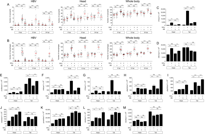 Fig. 4. The Cxcl8/Cxcr2 axis is required for the silica crystal-induced systemic inflammation. SiO2 crystals or PBS were injected in the hindbrain ventricle (HBV) of 2 dpf Tg(lyz:DsRED2) (A), Tg(mfap4:mCherry) (B) and wild type (C-M) larvae in the presence of either DMSO or the Cxcr2 inhibitor SB225002 (SB). Neutrophil (A) and macrophage (B) recruitment and number were analyzed at 6, 12 and 24 hpi by fluorescence microscopy, while the transcript levels of the indicated genes (C-M) were analyzed at 12 hpi by RT-qPCR in larval head and tail. Each dot represents one individual and the mean ± S.E.M. for each group is also shown. One representative RT-qPCR experiment from three biological replicates is shown. P values were calculated using one-way ANOVA and Tukey multiple range test. ns, not significant, *p ≤ 0.05, **p ≤ 0.01, ***p ≤ 0.001.
