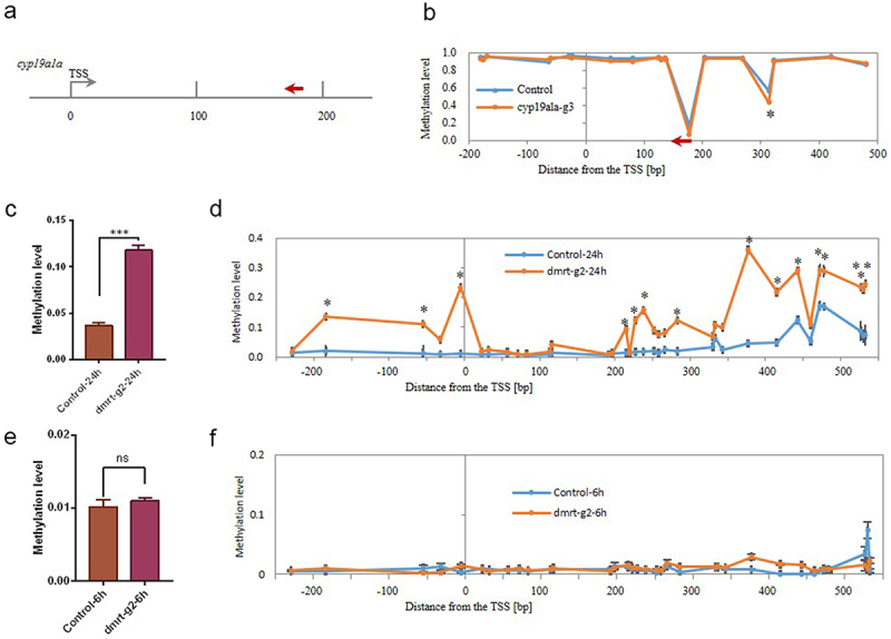 (a) Illustration of the locations of the gRNA designed for targeting the TSS region of the cyp19a1a gene; (b) Methylation levels of individual CpGs in the TSS region of the cyp19a1a gene; (c) The average DNA methylation level of target locus within the dmrt1 TSS region at 24 hpf. (d) Methylation levels of individual CpGs in the TSS region of the dmrt1 gene at 24 hpf. (e) The average DNA methylation level of target locus within dmrt1tss region at 6 hpf. (f) Methylation levels of individual CpGs in the TSS region of the dmrt1 gene at 6 hpf. The asterisk indicates statistical significance. (* p<0.05).