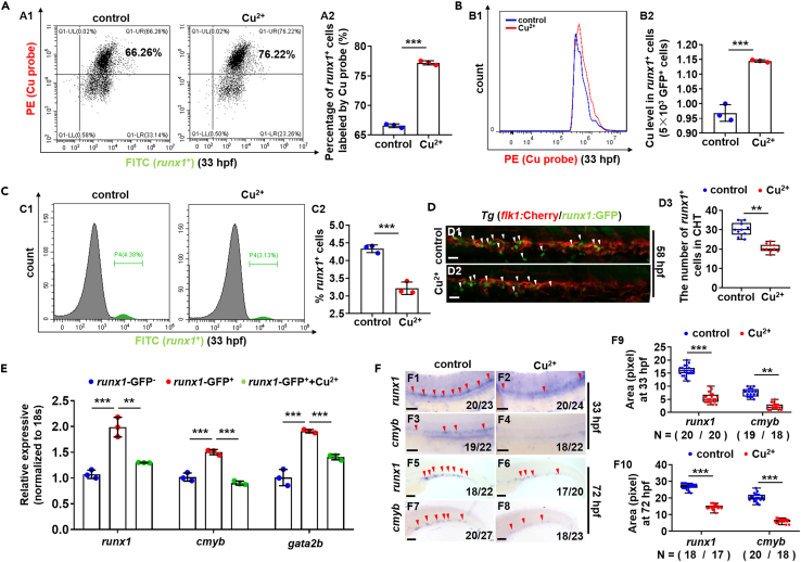 (A and B) Proportion of HSPCs labeled with Cu probe (A) and the Cu content in individual runx1GFP+ cells (HSPCs) (B) were increased in Cu-stressed embryos at 33 hpf. A1, flow cytometry (FACS) plots; B1, flow cytometry (FACS) histogram; A2, calculation of the percentage of runx1GFP+ cells labeled by Cu probe; B2, calculation of Cu level in individual runx1GFP+ cells.
