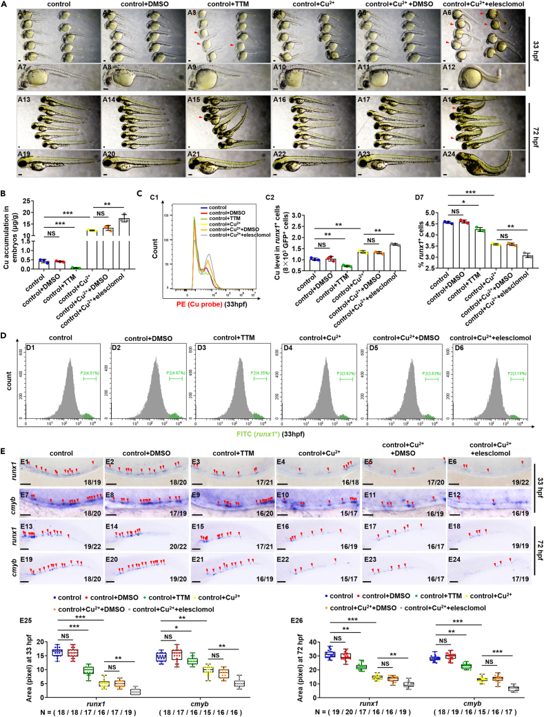 (C) Cu content in individual runx1GFP+ cells (HSPCs) of zebrafish embryos in control, DMSO exposed, TTM exposed, Cu exposed, Cu and DMSO co-exposed, or Cu and elesclomol co-exposed group at 33 hpf, respectively. C1, flow cytometry (FACS) histogram; C2, calculation of Cu level in individual runx1GFP+ cells.