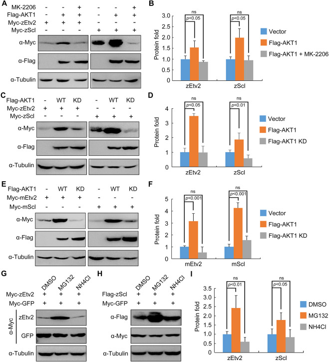 AKT stabilizes zEtv2 and zScl through its kinase activity. (A,B) HEK293T cells were co-transfected with plasmids expressing Flag-AKT1 and Myc-zEtv2 or -zScl, and treated with either DMSO or 0.5 μM MK-2206 for 24 h before undergoing western blot analysis. (C,D) Overexpression of wild-type (WT) AKT1 but not its kinase-deficient (KD) mutant stabilizes zEtv2 and zScl. (E,F) The promotion of mEtv2 or mScl expression level by AKT1 is dependent on its kinase activity. (G-I) zEtv2 and zScl proteins are degraded through the proteasome pathway. HEK293T cells co-transfected with plasmids encoding either Myc-zEtv2 or Flag-zScl and the negative control Myc-GFP were treated with either the lysozyme inhibitor NH4Cl (20 mM) or the proteasomal inhibitor MG132 (20 μM) for 5 h before harvest. In B,D,F,I, the gray values of the immunoreactive protein bands were quantified using ImageJ. Graphs show the density of the indicated protein signals relative to the corresponding Tubulin signals (mean±s.d., three independent biological repeats). Paired Student's t-test; ns, not significant.