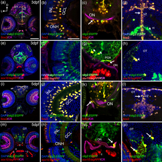 From 3 dpf onwards, OPCs cells spread throughout the visual system. At 3 dpf (a–h), olig2:EGFP/Sox2 cells are present in the INL, GCL, ONH (a, b), the optic chiasm (arrow in c), and the ventricular zones of the brain (arrow in d). Arborized olig2:EGFP cells are negative for Sox2 (arrowhead in d). sox10:tagRFP cells are present in the ONH (e, f) and the optic chiasm (e, arrow in g). Arborized olig2:EGFP/sox10:tagRFP cells are located in the POA with their projections surrounding the ON (arrowheads in g). OT also presented olig2:EGFP/sox10:tagRFP cells (arrowhead in h). At 5 dpf (i–p), olig2:EGFP/Sox2 cells are present in the INL, GCL (i, j), ON (arrow in k), and ventricular zones (arrow in l). olig2:EGFP/sox10:tagRFP cells are found in the ON with projections surrounding it (m, arrow in o), arborized olig2:EGFP/sox10:tagRFP cells are also present in the OT (arrows in p). Calretinin (CR) labels the ganglion cells and the ON. C: cartilage; D: dorsal; GCL: ganglion cell layer; H: hypothalamus; INL: inner nuclear layer; L: lateral; ON: optic nerve; ONH: optic nerve head; OT: optic tectum; POA: preoptic area; VZ: ventricular zone. Scale bar in a, e, i, m: 100 μm; in b, c, d, f, g, h, j, k, l, n, o, p: 50 μm