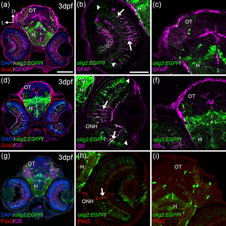 olig2:EGFP cells present other glial markers in the retina; GFAP and GS. olig2:EGFP cells also colocalized with Müller markers: GFAP (a, b) and GS (d, e) in the retina but not in the OT (c, f). Colocalization was detected mostly in the central area of the retina (arrows in band e), while cells in the periphery were just olig2:EGFP (arrowheads in b and e). olig2:EGFP cells in the periphery of the ONH do not colocalize with Pax2, typical maker for reticular astrocytes (g–i), although these two populations are very close (arrow in h). D: dorsal; L: lateral; H: hypothalamus; ONH: optic nerve head; OT: optic tectum. Scale bar in a, d, g: 100 μm; in b, c, e, f, h, i: 50 μm