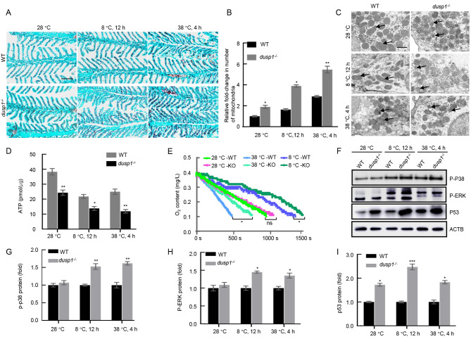 A: Scarlet (red) and brilliant green (blue) staining of gill sections of dusp1-/- and WT zebrafish under different temperature treatments. Mitochondria are in dark red and gill filaments are in green. Scale bar: 50 µm. Sample size=6 for each temperature-time treatment. B: Relative intensity of red fluorescence of the gill reflecting average number of mitochondria present in the gill section. Student’s t test, *: P<0.05; **: P<0.01. Sample size: n=6. C: Transmission electron microscopy of mitochondrial structure in the gills of dusp1-/- and WT zebrafish under different temperature treatments. Dark circular structures are typical mitochondria. Mitochondria with abnormal shapes are indicated by arrows. Scale bar: 1 µm. D: ATP production measured by ATP Assay Kit (Beyotime, China) in dusp1-/- and WT zebrafish gills under different temperature treatments. Student’s t test, *: P<0.05; **: P<0.01. Sample size: n=6 for each temperature-time point. E: Oxygen consumption rate measured using a respiratory oxygen consumption meter in dusp1-/- and WT fish under different temperature treatments. Sample size: n=6 for each curve, one-way ANOVA, *: P<0.05, ns: No significant difference. F–I: Western blot analyses of p-P38, p-ERK, and p53 in dusp1-/- and WT zebrafish exposed to different temperatures. Sample size n=6 for each measurement.