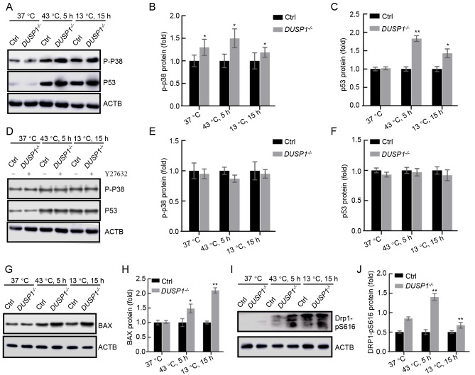 A–C: Western blotting of p-P38 and P53 in DUSP1-/- and WT 293T cells at three temperature time points. D–F: Western blot analyses of p-P38 and p53 in presence of Y27632. G, H: Western blot analysis of apoptosis-related protein BAX. I, J: Western blotting showing increased phosphorylation of DRP1 at S616 in DUSP1-/- cells. ACTB was used as the loading control.