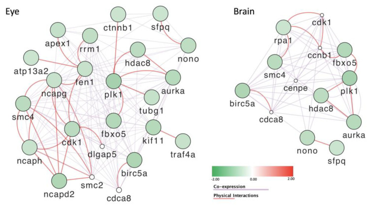 Differentially expressed genes that are involved in brain and eye development. These genes are all downregulated in zebrafish larvae treated with POP125× and form co-expression and physically interacting networks.