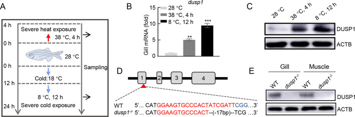A: Flowchart depicting cold and hot temperature treatments in zebrafish for sampling. Three-month-old zebrafish reared at 28 °C were subjected to cold treatment by exposure to 18 °C for 12 h and 8 °C for 12 h. Hot temperature treatment was carried out by exposing fish to 38 °C for 4 h, with controls maintained at 28 °C. Samples for qRT-PCR and immunoblot analysis were collected at three temperature-time points (28 °C, 38 °C 4 h, 8 °C 12 h). Sample size: n=30. B: Dusp1 expression under cold and hot treatment measured using qRT-PCR compared with normal temperature controls. Data are mean±SD. **: P<0.01; ***: P<0.001. C: Western blot analysis of DUSP1 protein levels in gills under thermal stress, with ACTB as the loading control. D: Schematic of targeted dusp1 gene editing by CRISPR/Cas9 and disruption of dusp1 at exon 1. E: Western blot validation of loss of dusp1 in dusp1-KO fish indicated by two tissues examined.