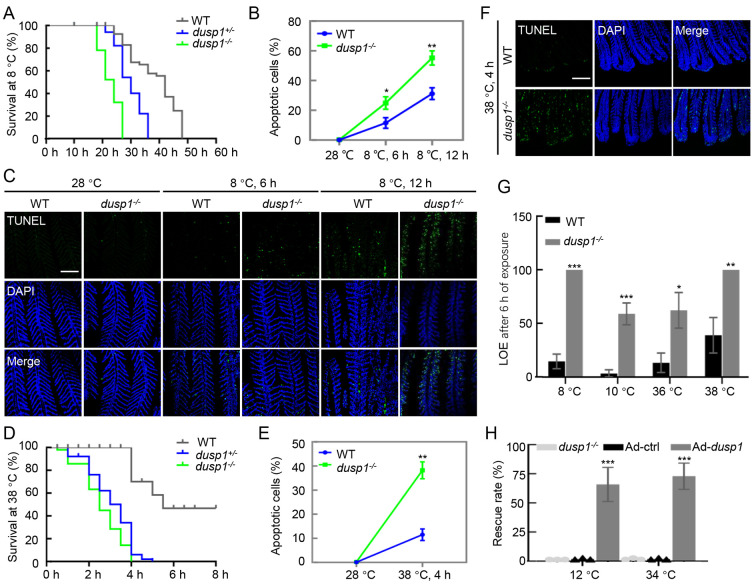 Thermal challenges were the same as described above. Sample size was 30 for each thermal challenge and at least three biological replicates were performed. A: Kaplan-Meier curves of three genotypes (dusp1-/-, dusp1+/-, and WT) treated by 8 °C exposure. B: Quantified apoptotic signal in gills under cold exposure analyzed by ImageJ software. Student’s t-test, *: P<0.05; **: P<0.01. C: TUNEL assay showing apoptotic signal in gills under 8 °C treatment. Scale bar: 100 µm. D: Kaplan-Meier curves of three genotypes (dusp1-/-, dusp1+/-, and WT) under 38 °C exposure. E: Quantified apoptotic signal in gills under hot exposure analyzed by ImageJ software. Student’s t-test, **: P<0.01. F: TUNEL assay of apoptosis in gills under hot (38 °C for 4 h) treatment. Scale bar: 100 µm. G: Differences in upper and lower lethal temperature tolerance between WT and dusp1-/- zebrafish. LOE indicates loss of equilibrium. Half survival rates (i.e., LOE rate) of dusp1-/- fish occurred at 10 °C and 36 °C, respectively, under cold and heat challenges, while WT fish exhibited half survival rates at 8 °C and 38 °C, respectively. One-way ANOVA, *: P<0.05; **: P<0.01; ***: P<0.001. H: Rescue of dusp1-/- mutant by zebrafish dusp1 mRNA (Ad-dusp1). Adding dusp1 mRNA restored the survival rate of embryos under cold (8 °C) and hot (38 °C) treatment. The same amount of GFP mRNA (Ad-ctrl) and dusp1-/- embryos without injection were used as controls. One-way ANOVA, ***: P<0.001.