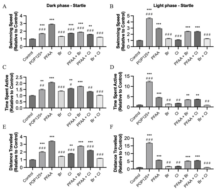 Swimming speed (A,B), time spent active (C,D), and distance traveled (E,F) for all treatments. Left column, parameters during the dark phase, right column, parameters during the light phase. All results were calculated using 50 s during the transition zone between light and dark phases, n = 72, p ≤ 0.01 (**), ≤0.001 (***). Asterisks (*) indicate when significant differences were found compared to control, hash sign (#) when differences were found against PFAA.