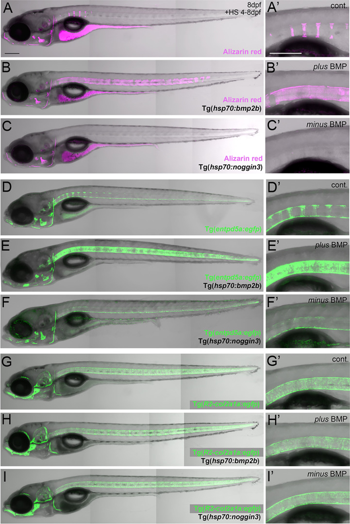 BMP regulates mineralization and entpd5a expression along the notochord. (A–I) Lateral views of zebrafish larvae shown in merged transmitted and fluorescent light channels with tissue staining and genotypes as indicated at an age of 8dpf. Alizarin red labels mineralized extracellular matrix (ECM) in magenta (A–C). entpd5a-expressing cells are visualized by Tg(entpd5a:egfp) in green (D–F), col2a1-expressing chondroblasts and chordoblasts by Tg(R2-col2a1a:egfp) in green (G–I). Magnified views of the region right dorsal to the swim bladder from corresponding larvae are shown in A’ o I’. All larvae have been heat-shocked once a day for 45 minutes at 40°C from 4-8 dpf. Note the ventral line of chordoblasts along the entire length of the notochord that remained EGFP positive after noggin3 overexpression (F, F’), pointing to BMP-independent regulation in this particular notochordal subdomain. Scale bars: 200 µm.