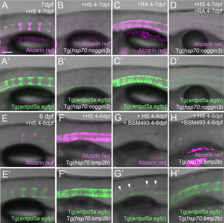 RA cannot promote notochord sheath mineralization when BMP signaling is blocked during initiation phases of mineralization. (A–D’) RA fails to induce hyper-mineralization of the notochord sheath while BMP signaling is blocked. (E–H’) BMP induced ectopic entpd5a activation cannot be hindered by interfering with the intra-cellular signal transduction of the RA pathway. (A–H’) Lateral views of transgenic zebrafish larvae shown in merged transmitted and fluorescent light channels with tissue stainings, genotypes and treatments as indicated at an age of 7dpf (A–D’) or 6dpf (E–H’). Heat-shocks were performed once a day for 45 minutes at 40°C. Arrowheads in (G’) point to faintly EGFP-positive chordoblasts in areas of presumably segmented Tg(entpd5a:egfp) expression. Image-pairs X/X’ show identical specimens. Scale bar (shown in A, applying to all panels): 100 µm.