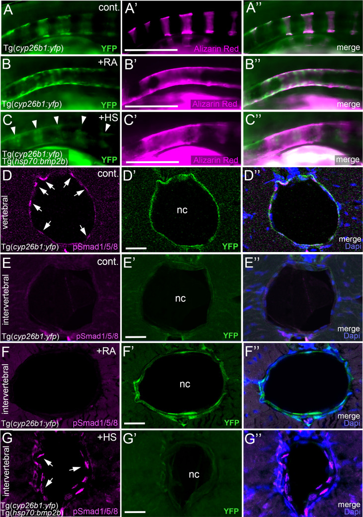 BMP and RA signaling do not act via each other. (A–C’’) BMP-induced hyper-mineralization is not accompanied by an ectopic activation of the RA signaling reporter Tg(cyp26b1:yfp) in the notochord epithelium. Lateral views of notochords immediately dorsal to the swim bladder, anterior to the left. Images were taken by conventional fluorescent light microscopy and are shown as separate 488nm (A–C), 555nm (A’–C’) channels and with both channels merged (A’’–C’’). The cyp26b1:yfp transgene (A–C, A’’–C’’, green) labels chordoblasts and serves as a readout for RA-responsiveness. Alizarin red stains the mineralized notochord sheath (A’–C’, A’’–C’’ magenta). Note the remaining segmented YFP signal after global overexpression of BMP2b (C, arrowheads). (D–G’’) Exposure of larvae to 1 µM RA does not cause ectopic pSmad1/5/8 appearance at intervertebral positions of the chordoblast layer. Cross-sections through the abdominal notochord of 7 dpf control Tg(cyp26b1:yfp) (D–E’’), RA-treated Tg(cyp26b1:yfp) (F–F’’), and heat-shocked Tg(cyp26b1:yfp), Tg(hsp70:bmp2b) (G–G’’) larvae co-stained via immunofluorescence labeling for the activated/phosphorylated BMP signal transducer pSmad1/5/8 and for YFP, encoded by the RA responder transgene. In untreated controls, pSmad1/5/8 reactivity is restricted to vertebral segments co-expressing the RA reporter transgene (D–D’’) but absent from intervertebral spaces lacking Tg(cyp26b1:yfp) expression (E–E’’). Upon RA-treatment, such intervertebral domains (identified as such by the lack of pSmad1/5/8 activity) display ectopic Tg(cyp26b1:yfp) activity, although RA fails to induce ectopic pSmad1/5/8 reactivity (F-F’’). In contrast, as a positive control, ectopic pSmad1/5/8 reactivity in intervertebral regions, identified as such by the lack of Tg(cyp26b1:yfp) activity, is obtained by heat shock-induced ubiquitous Tg(hsp70:bmp2b) expression (G-G’’). Images represent single confocal slices shown as separate channels 555nm in magenta (D–G), 488nm in green (D’–G’) and merged with Dapi (D’’–G’’). Arrows in (D, G) point at exemplary pSmad1/5/8 positive chordoblasts. Whole figure: Genotype, age, labeling and treatments as indicated. Heat-shocks were performed once a day for 45 minutes at 40°C from 4-7 dpf. RA was applied constantly from 4-7 dpf. Scale bars: 200 µm (B); 20 µm (D’–G’). cont., vehicle-treated control; nc, notochord; HS, heat shock; RA, Retinoic acid.
