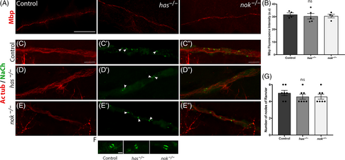 Fig. 3 Pals1a and aPKCλ are not required for Mbp expression and Nach clustering along the PLLn. (A) Lateral views of Mbp immuno-labeling in control, has−/− and nok−/− embryos at 3 dpf. Scale bar = 50 μm. (B) Quantification of Mbp fluorescence intensity along the PLLn in control (average of 31.71 ± 1.34, n = 4 embryos), has−/− (average of 30.37 ± 2.17, n = 5 embryos), and nok−/− (average of 30.5 ± 1.41, n = 4 embryos) embryos at 48 hpf (ns, P > .85 in all cases), a.u, arbitrary unit. Lateral views of Acetylated tubulin and NaCh labeling in control (C-C″), has−/−(D-D″), and nok−/− (E-E″) embryos at 3 dpf. Arrows indicate NaCh clustering along PLL axons. Scale bars = 5 μm. (F) Higher magnification of NaCh clusters in control, has−/− and nok−/− embryos respectively from left to right. Scale bar = 1 μm. (G) Graph depicting the number of sodium channels clusters observed within a defined region of the PLLn in the tail area at 3 dpf in control (5 ± 0.31 clusters; n = 7 embryos), has−/− (4.57 ± 0.29; n = 7 embryos), and nok−/− (4.57 ± 0.3; n = 7 embryos) embryos. (ns, P > .85 in all cases)