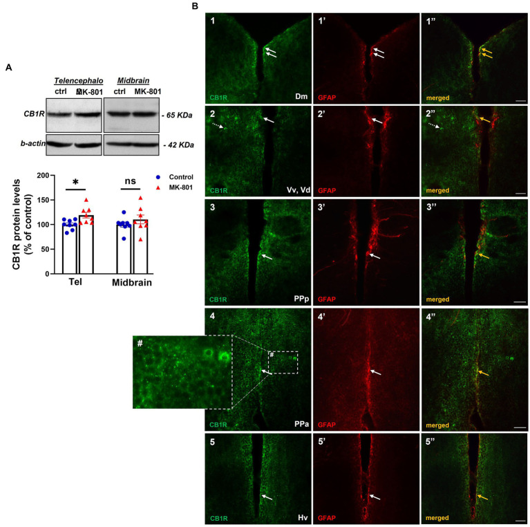Altered endocannabinoid signaling in telencephalon of MK-801-treated zebrafish. (A) Representative blots and quantification of the relative expression levels of CB1R in telencephalon and midbrain. n = 8 per experimental group. Data are expressed as mean ± SEM. *p ≤ 0.05, ns, non-significant, compared to control group. (B1–5’’) Immunofluorescent microphotographs of selected transverse sections showing colocalization of CB1R with GFAP immunoreactive cells in the periventricular zone within different nodes of the SDMN. (B1–1’’) medial zone of the dorsal telencephalic area (Dm), (B2–2’’) ventral nucleus of the ventral telencephalic area/dorsal nucleus of the ventral telencephalic area (Vv/Vd), (B3–3’’) parvocellular preoptic nucleus, anterior part (PPa), (B4–4’’) parvocellular preoptic nucleus, posterior part (PPp), (B5–5’’) ventral zone of periventricular hypothalamus (Hv). Arrows indicate examples of colocalization, dashed arrows point to single positive cells. Within brain parenchyma, CB1R-immunostaining is intensively present in punctate structures around or in close proximity with cell somata (B4#). Microphotographic images are representative of MK-801-treated fish. Scale bar: 25 μm.